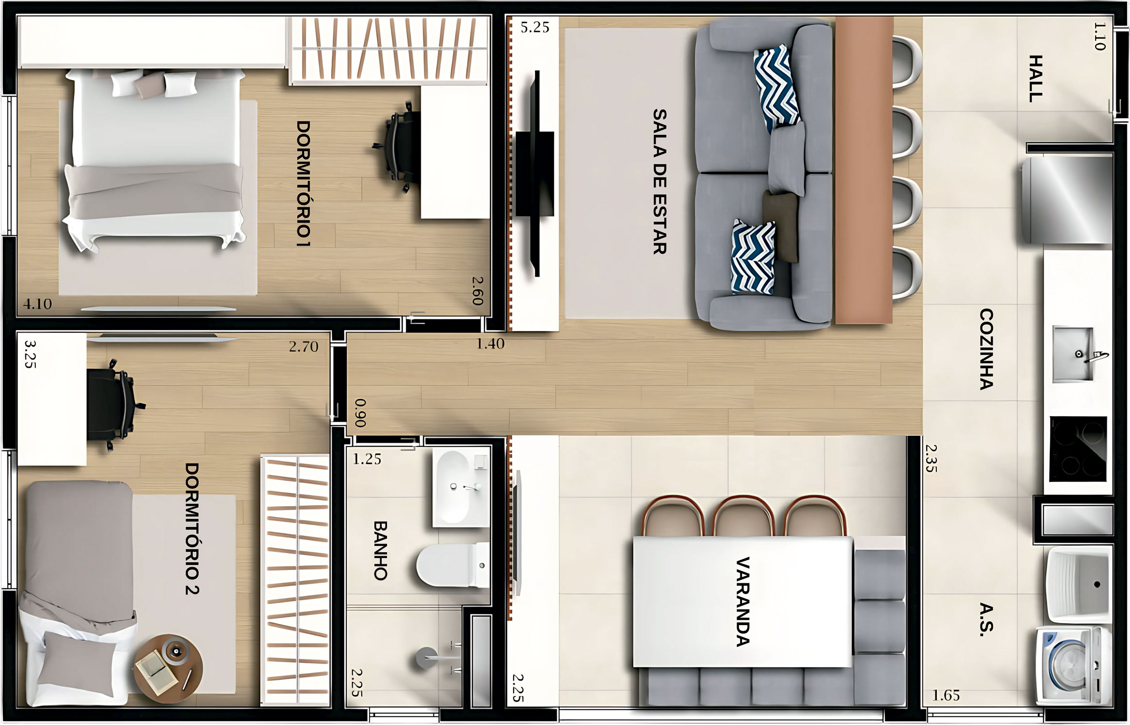 Com 60,11m², o apartamento possui 2 dormitórios, com varanda em um espaço confortável para acomodar toda a sua família.
